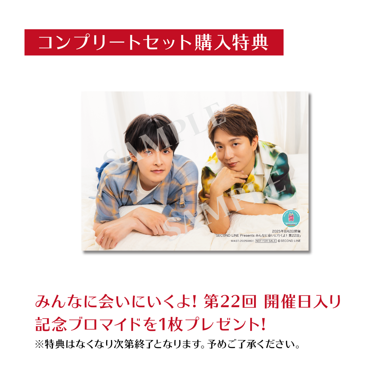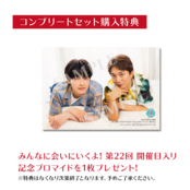 さらにコンプリートセット購入通販特典として「SECOND LINE Presents みんなに会いに行くよ! 第22回 in 静岡 開催日入り記念ブロマイド」全1種をプレゼント(コンプリートセット購入通販特典はなくなり次第終了となります。予めご了承ください)!
