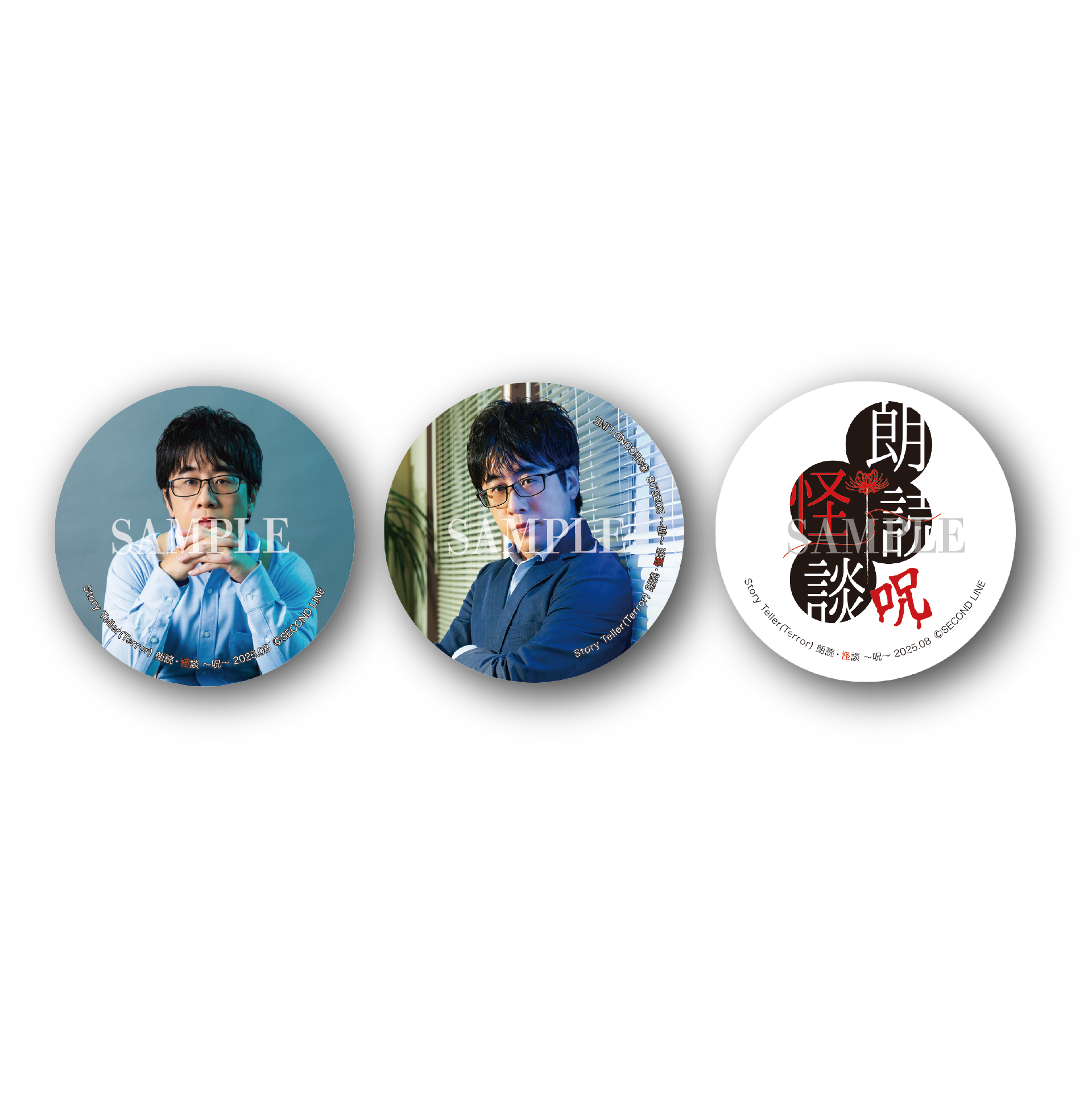 ※3種セット(加藤将之さん柄 缶バッジ 全2種 各1個、Story Teller(Terror) 朗読・怪談 -呪- 缶バッジ 全1種 1個が揃います)販売です。