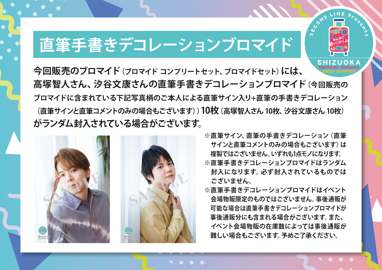 ※高塚智人さん、汐谷文康さんのサイン入り+直筆手書きコメント入りデコレーションブロマイド(直筆サインと直筆コメントのみの場合もございます)がランダム封入されている場合がございます(高塚智人さん、汐谷文康さんサイン入り+直筆手書きコメント入りデコレーションブロマイド各人全10種各1枚)。