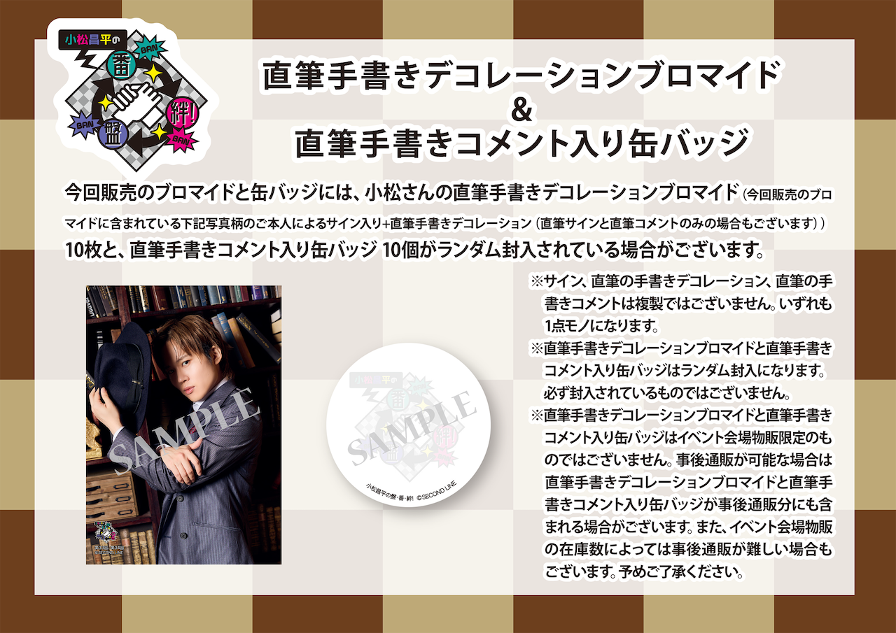 ※小松昌平さんのサイン入り+直筆の手書きコメント入りデコレーションブロマイドはイベント物販にてブロマイドが完売したため、ランダム封入はございません。