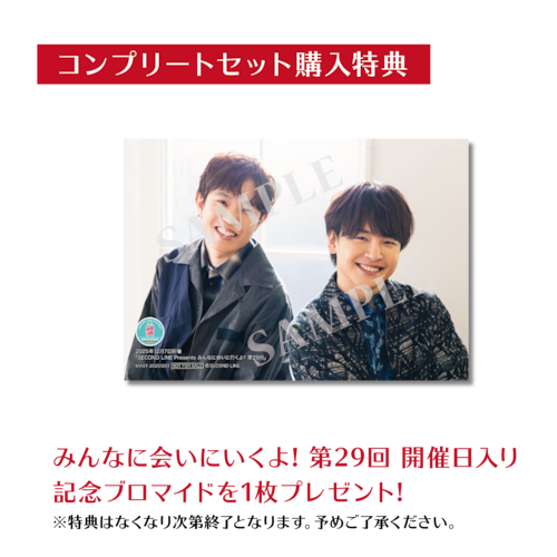 さらにコンプリートセット購入通販特典として「SECOND LINE Presents みんなに会いに行くよ! 第29回 in 静岡 開催日入り記念ブロマイド」全1種をプレゼント(コンプリートセット購入通販特典はなくなり次第終了となります。予めご了承ください)!