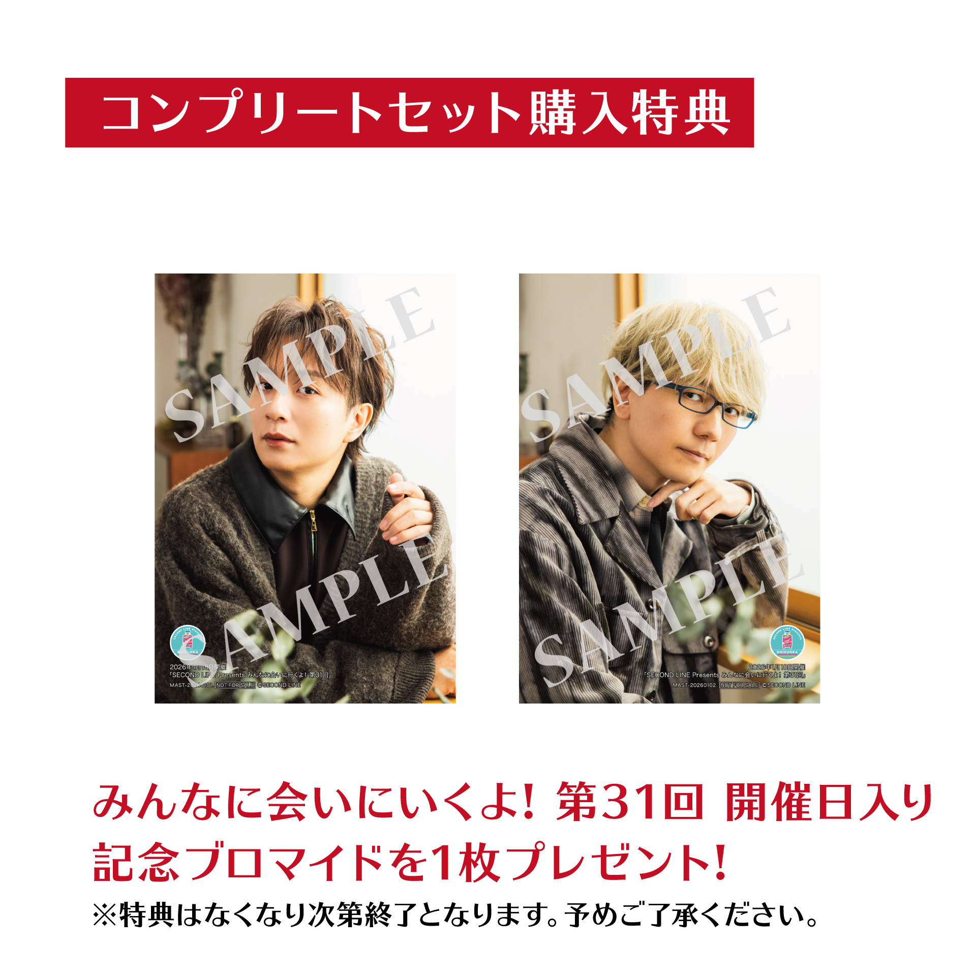 さらにコンプリートセット購入通販特典として「SECOND LINE Presents みんなに会いに行くよ! 第31回 in 静岡 開催日入り記念ブロマイド」全2種(中澤まさともさん写真柄 1枚、山中真尋さん写真柄 1枚)をプレゼント(コンプリートセット購入通販特典はなくなり次第終了となります。予めご了承ください)!