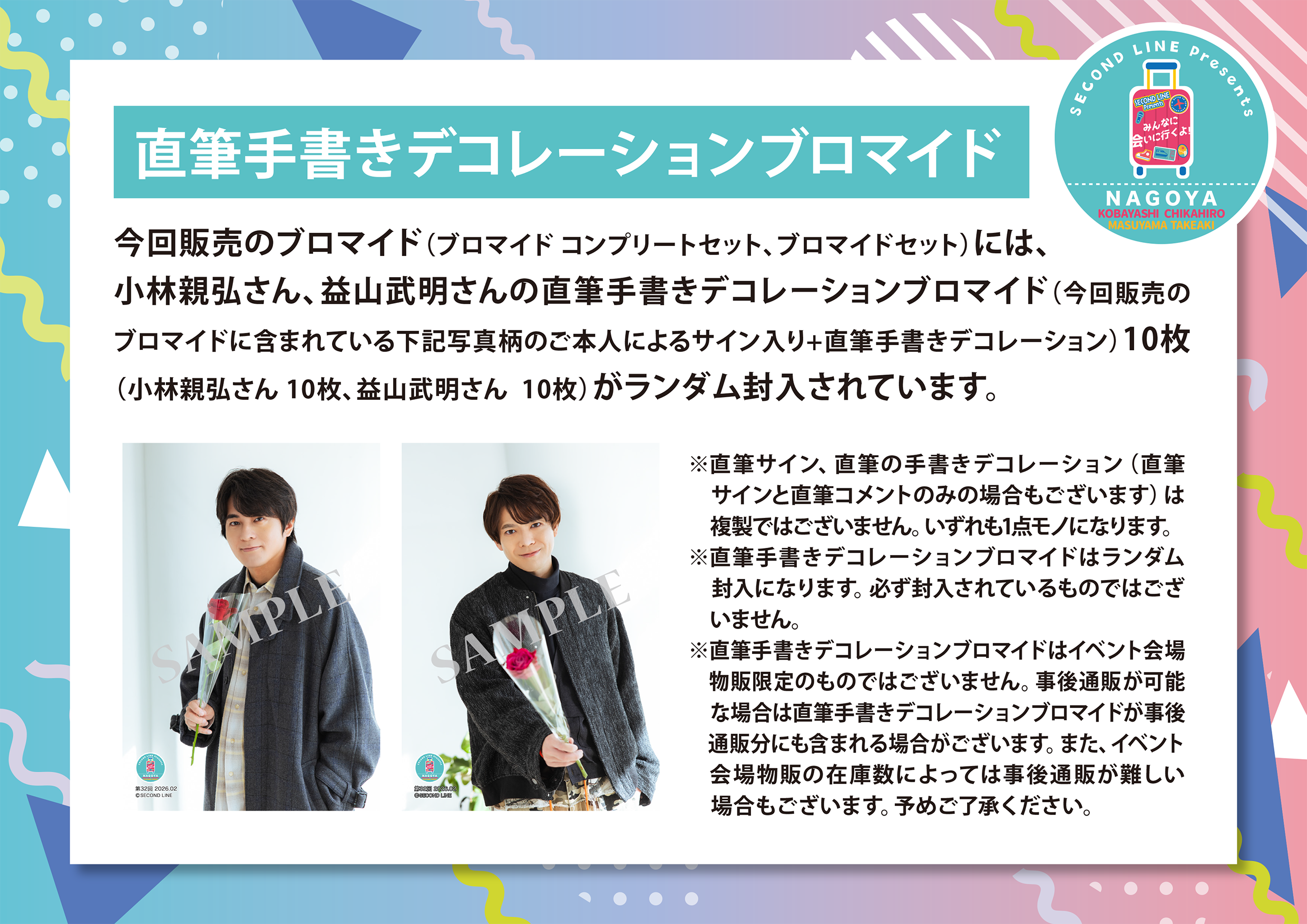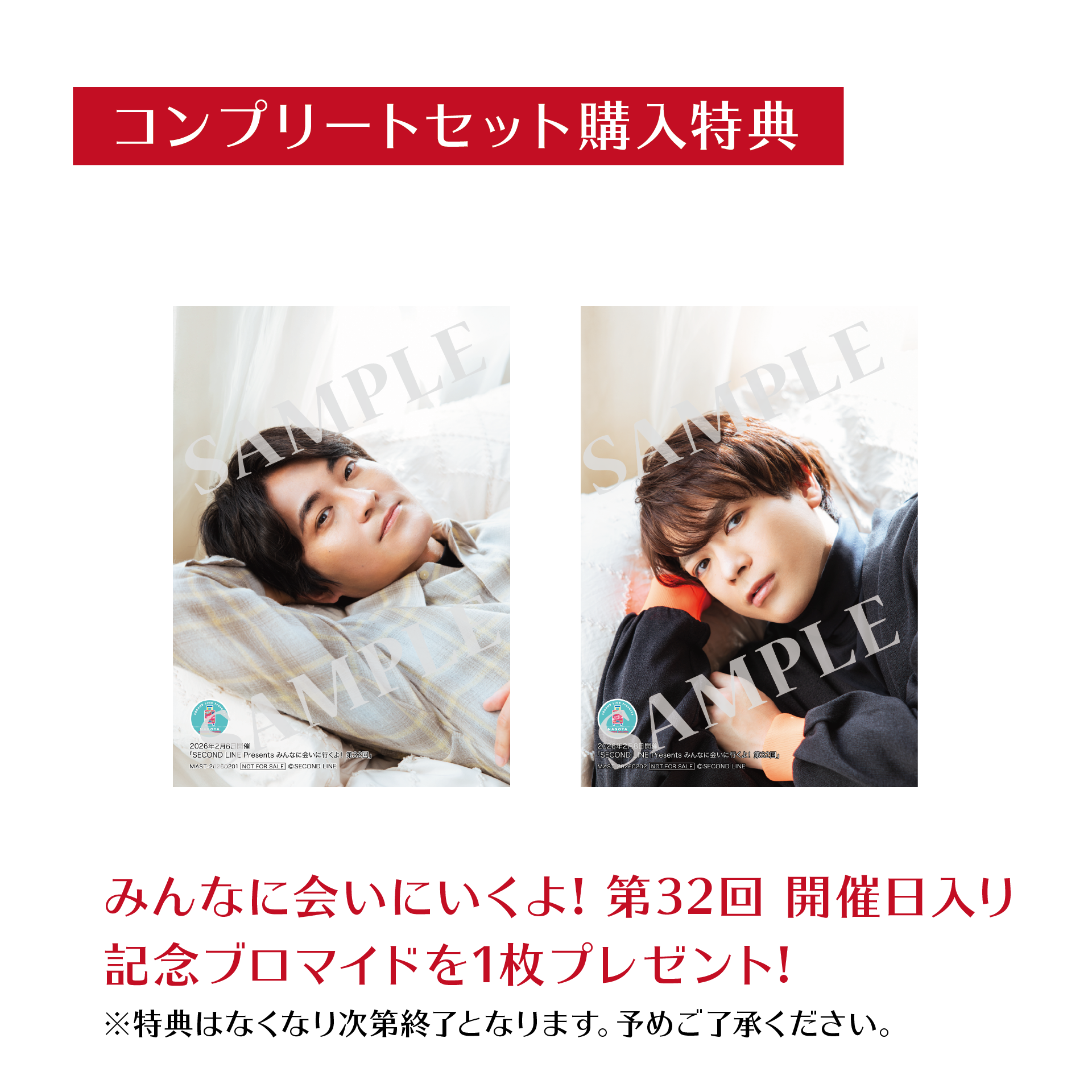 さらにコンプリートセット購入通販特典として「SECOND LINE Presents みんなに会いに行くよ! 第32回 in 名古屋 開催日入り記念ブロマイド」全2種(小林親弘さん写真柄 1枚、益山武明さん写真柄 1枚)をプレゼント(コンプリートセット購入通販特典はなくなり次第終了となります。予めご了承ください)!