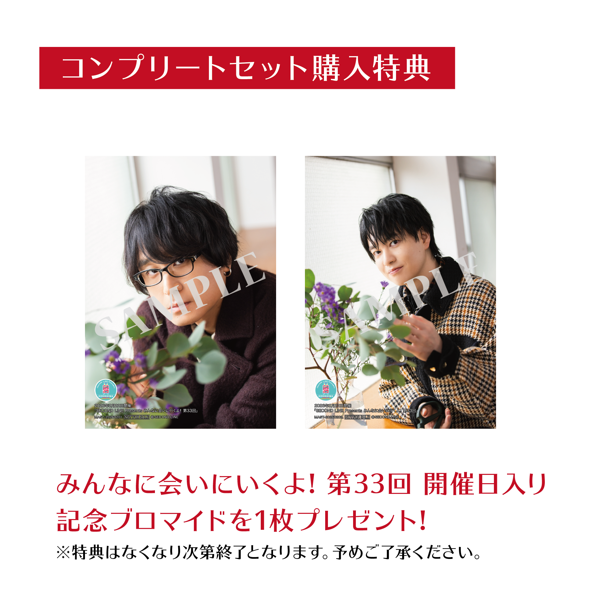 さらにコンプリートセット購入通販特典として「SECOND LINE Presents みんなに会いに行くよ! 第33回 in 広島 開催日入り記念ブロマイド」全2種(笠間淳さん写真柄 1枚、小林裕介さん写真柄 1枚)をプレゼント(コンプリートセット購入通販特典はなくなり次第終了となります。予めご了承ください)!