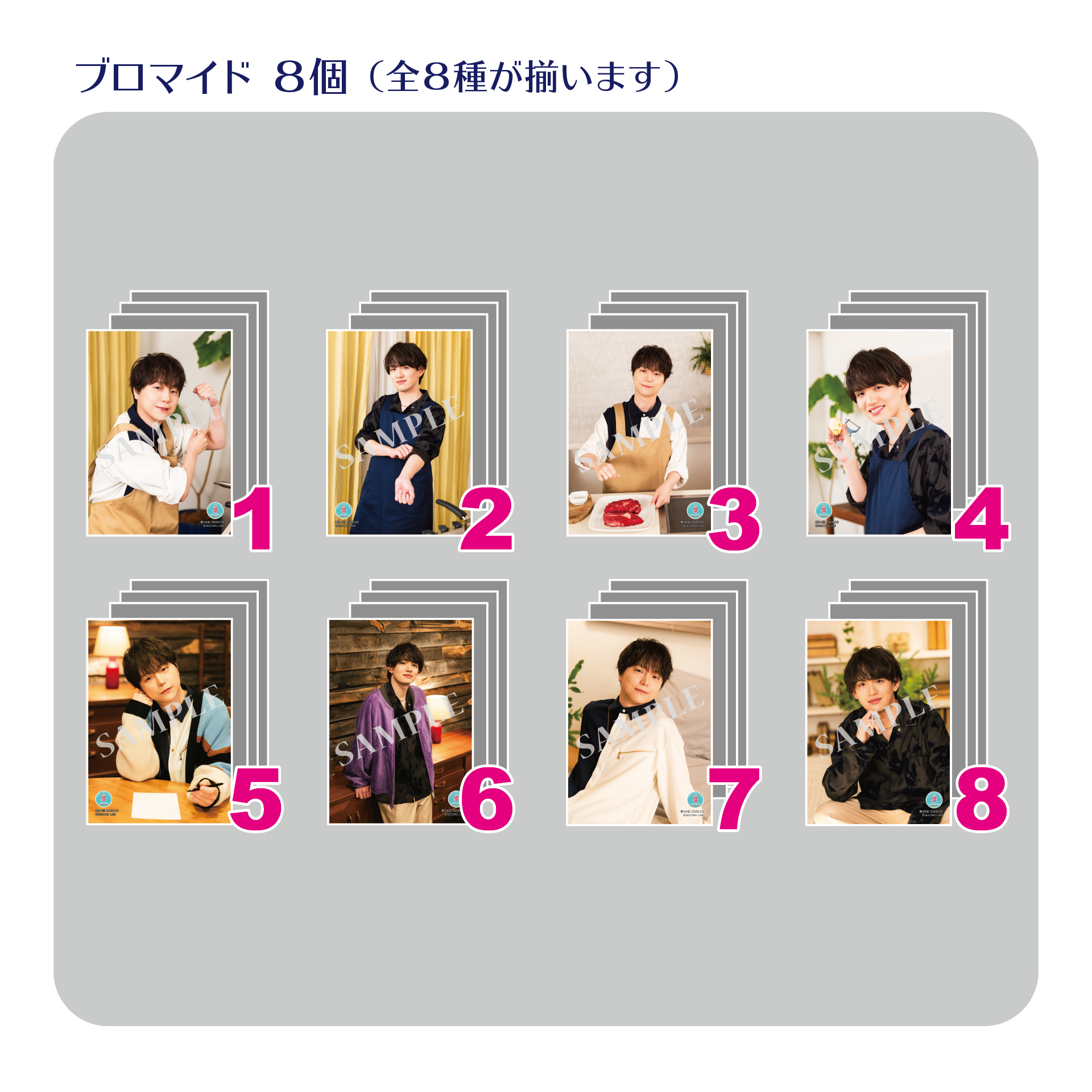 ※ブロマイド全8種に加え、河西健吾さん、または、大野智敬さんのサイン入り+直筆手書きコメント入りデコレーションブロマイド(直筆サインと直筆コメントのみの場合もございます)がランダム封入されている場合がございます(河西健吾さん、または、大野智敬さんサイン入り+直筆手書きコメント入りデコレーションブロマイド各人全10種各1枚)。