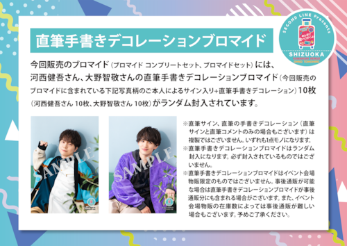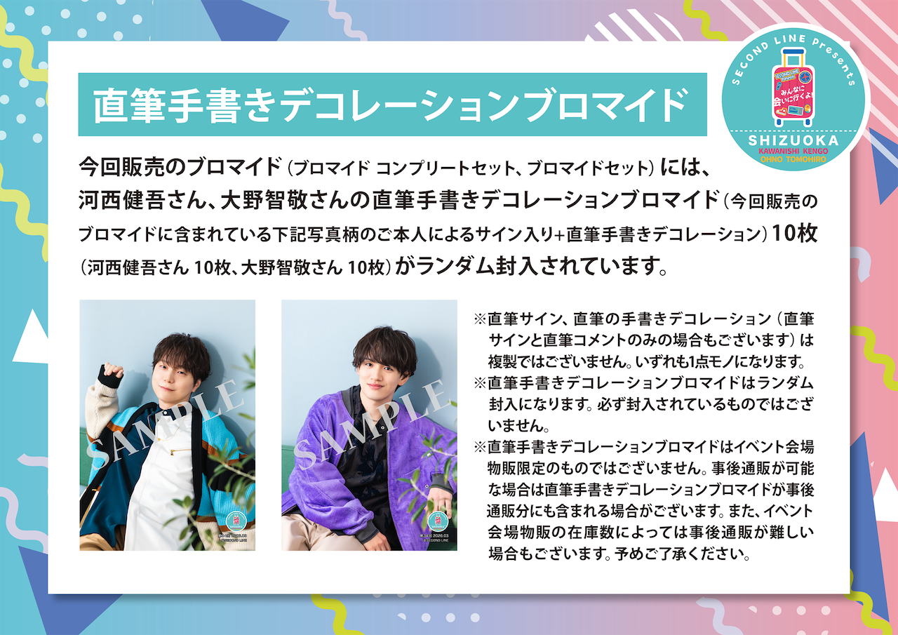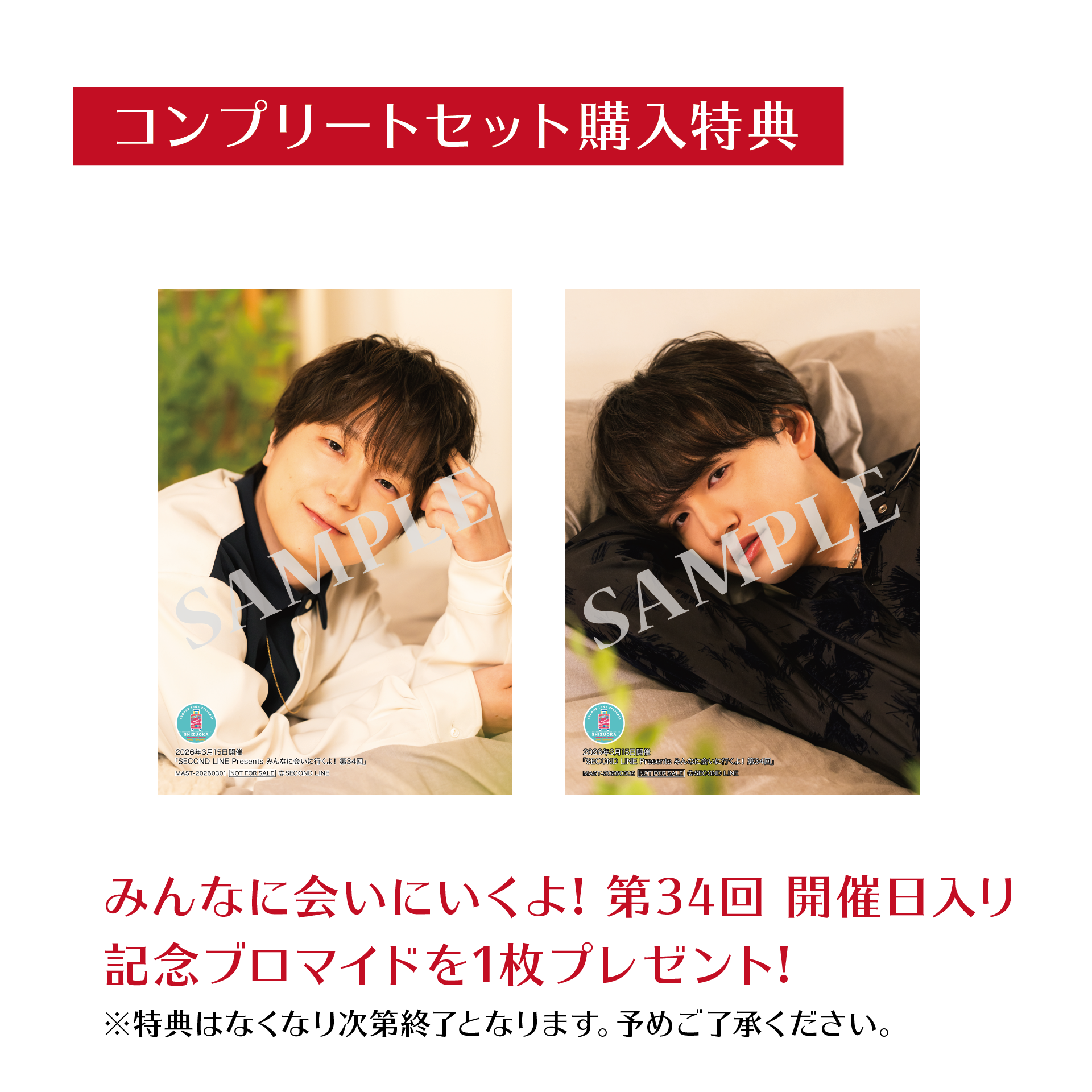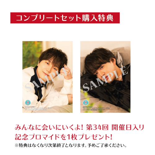 さらにコンプリートセット購入通販特典として「SECOND LINE Presents みんなに会いに行くよ! 第34回 in 静岡 開催日入り記念ブロマイド」全2種(河西健吾さん写真柄 1枚、大野智敬さん写真柄 1枚)をプレゼント(コンプリートセット購入通販特典はなくなり次第終了となります。予めご了承ください)!