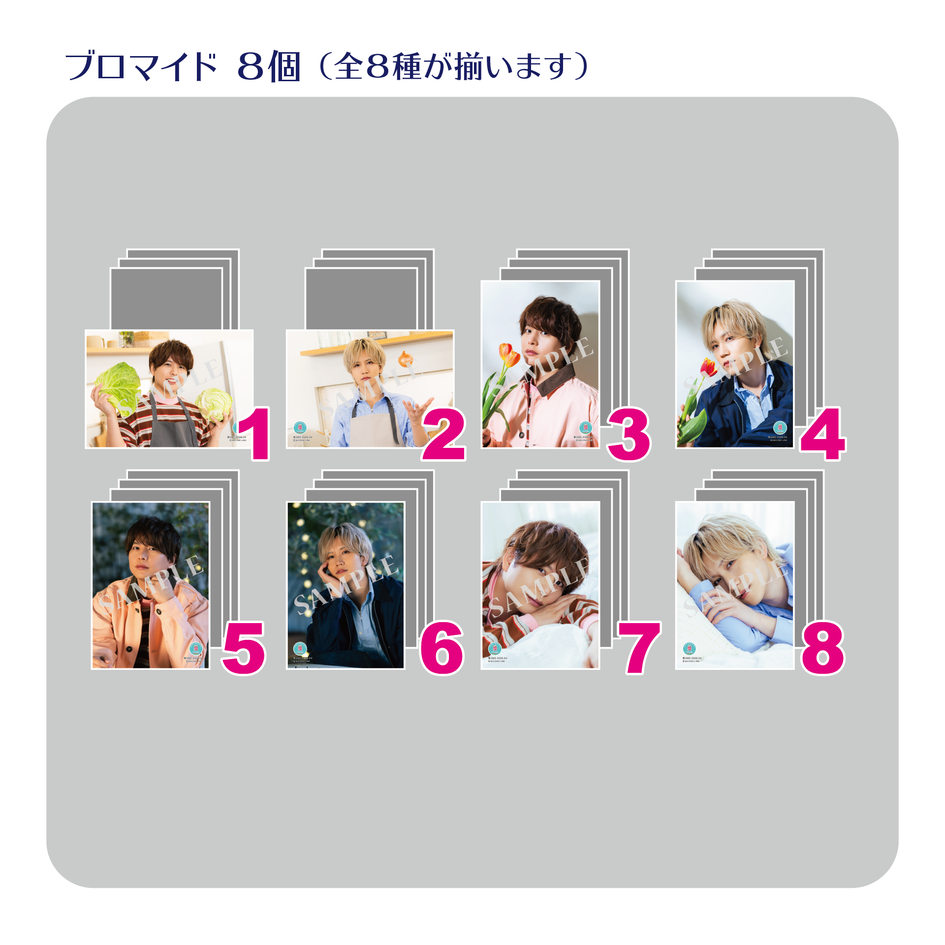 ※ブロマイド全8種に加え、仲村宗悟さん、または、小笠原仁さんのサイン入り+直筆手書きコメント入りデコレーションブロマイド(直筆サインと直筆コメントのみの場合もございます)がランダム封入されている場合がございます(仲村宗悟さん、または、小笠原仁さんサイン入り+直筆手書きコメント入りデコレーションブロマイド各人全10種各1枚)。